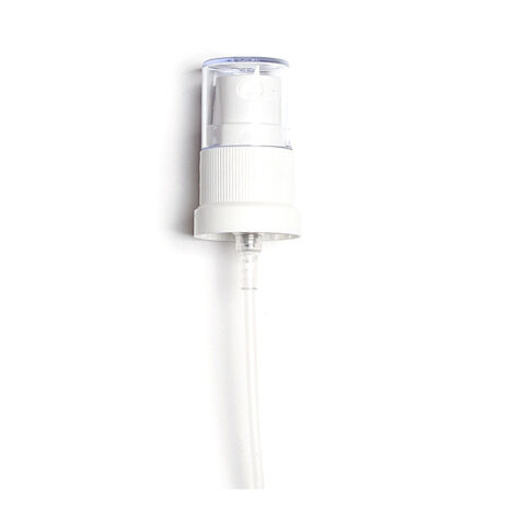 Pump atomizer, volume 0.14ml / stroke, with white screw cap and transparent protective cap, riser tube natural colour.